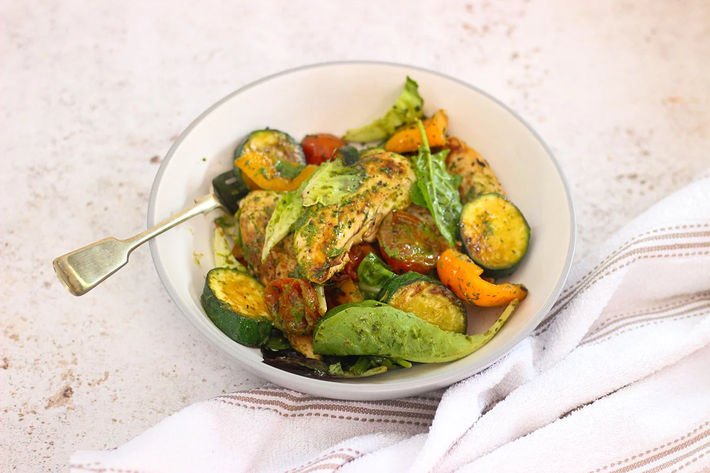 Add the chicken, cooked vegetables and pesto and toss lightly.